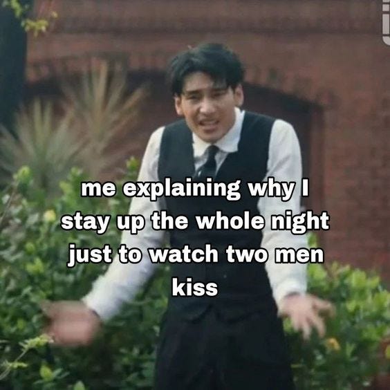 There are however queer people watching and reading BL because of its representation. Good queer media has taken a hot minute to get to where we are but it exists for the girls and the gays and the theys to recognise themselves as elastic beings with the kindness and the softness and the selfishness they deserve.