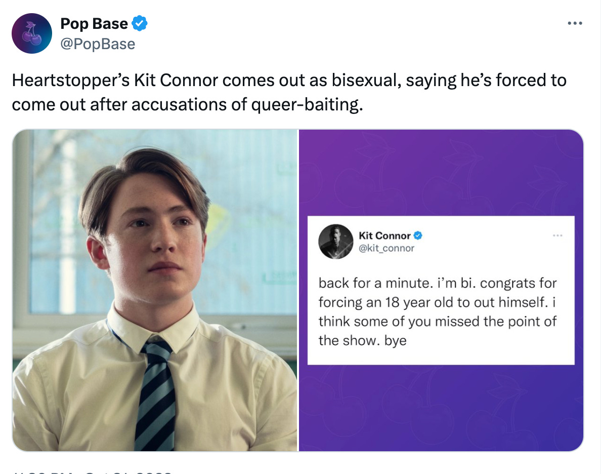Whilst I don’t speak for gay men—and to all the gays that love me, let me know if I’m talking shit!— I do understand that the fetishisation emerging from the world of BL’s is practically inescapable. Being accosted on the question of whether you’re a bottom or a top as if that should be public information and seeing your community being represented through poorly written stories is only two examples. I’ve talked about Minority Media before, where a piece of literature or film scrutinises the minority it’s “representing” whilst completely eradicating any ounce of story. Black people get it. Marginalised women get it. And the gays without a doubt also get it. We’re in a flux between wanting to represent queer identities and wanting queer identities to represent what we’ve categorised them as. Heartstopper actor Kit Connor was bullied into coming out on Twitter so that teenage girls—and the odd middle aged woman—could fantasise about him and co star Joe Locke actually being together omg omg omg!!!!