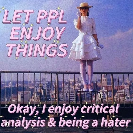 But hating can be deeply cathartic. To me, and probably a good amount of people, excessive positivity is only making the plight of our current society worse. Things like hope core and core core have more balance in recognising suffering and finding solace regardless. I recently saw a video of a girl saying that she wanted to make a book club, exclusively about bad books. I hate-read sometimes, so the idea was intriguing to me, Not because I wanted to be mean to an author but because critique is necessary when it counts.